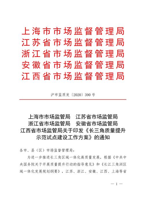为进一步推进长三角区域一体化高质量发展,根据《中共中央国务院关于开展质量提升行动的指导意见》和《长江三角洲区域一体化发展规划纲要》,江苏、浙江、安徽、江西、上海等省市市场监管局共同研究制定了《长三角质量提升示范试点建设工作方案》,现印发给你们,请结合本地区实际认真贯彻执行。