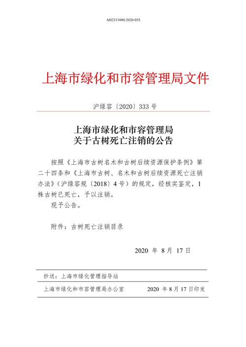 按照《上海市古树名木和古树后续资源保护条例》第二十四条和《上海市古树、名木和古树后续资源死亡注销办法》(沪绿容规〔2018〕4号)的规定,经核实鉴定,1株古树已死亡,予以注销。