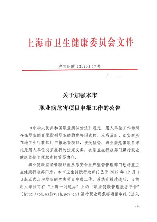 职业健康监督管理职能从原安全生产监督管理部门划转至卫生健康行政部门后,本市卫生健康行政部门已于2019年12月1日起正式启动职业病危害项目申报工作。系统升级改造后,目前用人单位可在“上海一网通办”上的“职业健康管理服务平台”(http://oh.wsjkw.sh.gov.cn)进行职业病危害项目申报(进入该平台后可在“事务办理”栏下载相关操作手册)。用人单位在线完成填报后,应当打印申报回执和申报表留档备查。