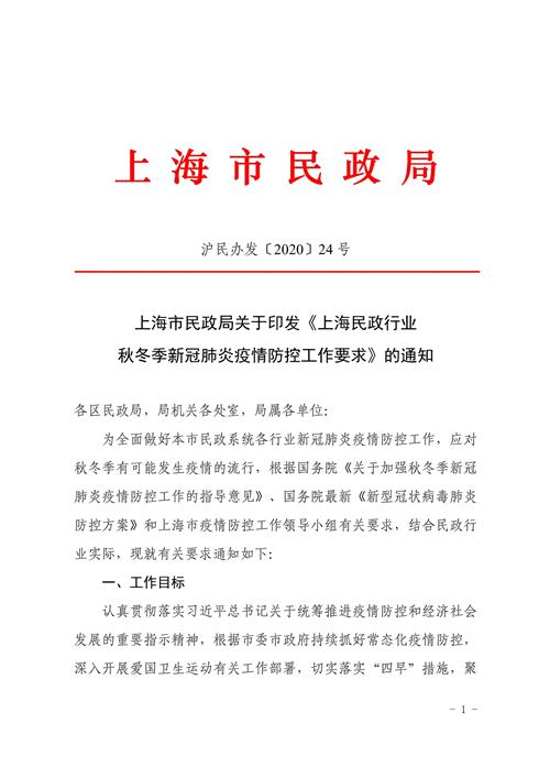 为全面做好本市民政系统各行业新冠肺炎疫情防控工作,应对秋冬季有可能发生疫情的流行,根据国务院《关于加强秋冬季新冠肺炎疫情防控工作的指导意见》、国务院最新《新型冠状病毒肺炎防控方案》和上海市疫情防控工作领导小组有关要求,结合民政行业实际,现就有关要求通知如下: