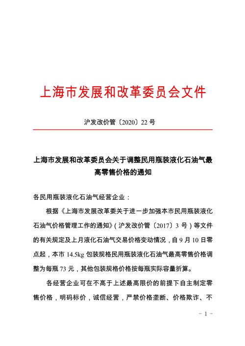 根据《上海市发展改革委关于进一步加强本市民用瓶装液化石油气价格管理工作的通知》(沪发改价管〔2017〕3号)等文件的有关规定及上月液化石油气交易价格变动情况,自9月10日零点起,本市14.5kg包装规格民用瓶装液化石油气最高零售价格调整为每瓶73元,其他包装规格价格按每瓶实际容量折算。