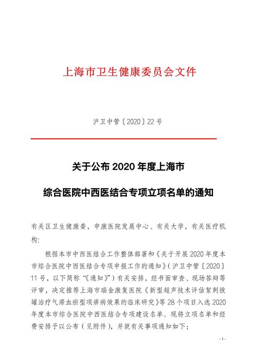 根据本市中西医结合工作整体部署和《关于开展2020年度本市综合医院中西医结合专项申报工作的通知》(沪卫中管〔2020〕11号,以下简称“《通知》”)有关安排,经书面审查、现场答辩等评审,决定推荐上海市瑞金康复医院《新型超声技术评估絮刺拔罐治疗气滞血瘀型项痹病效果的临床研究》等28个项目入选2020年度本市综合医院中西医结合专项建设名单。现将立项名单和经费安排予以公布(见附件),并就有关事项通知如下: