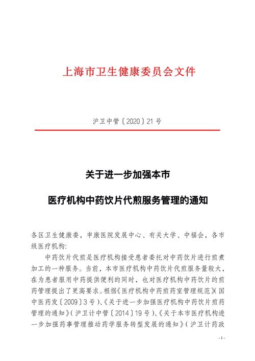 中药饮片代煎是医疗机构接受患者委托对中药饮片进行煎煮加工的一种服务。当前,本市医疗机构中药饮片代煎服务量较大,在为患者服用中药提供便利的同时,也对医疗机构中药饮片的煎药管理提出了更高要求。根据《医疗机构中药煎药室管理规范》(国中医药发〔2009〕3号)、《关于进一步加强医疗机构中药饮片煎药管理的通知》(沪卫计中管〔2014〕19号)、《关于本市医疗机构进一步加强药事管理推动药学服务转型发展的通知》(沪卫计药政〔2018〕6号)、《关于印发<上海市中药饮片服务质量提升工程实施意见>的通知》(沪卫中管〔2020〕13号)等要求,为进一步加强本市医疗机构中药饮片煎药管理,提升煎药服务水平,结合本市实际,现将有关工作要求通知如下: