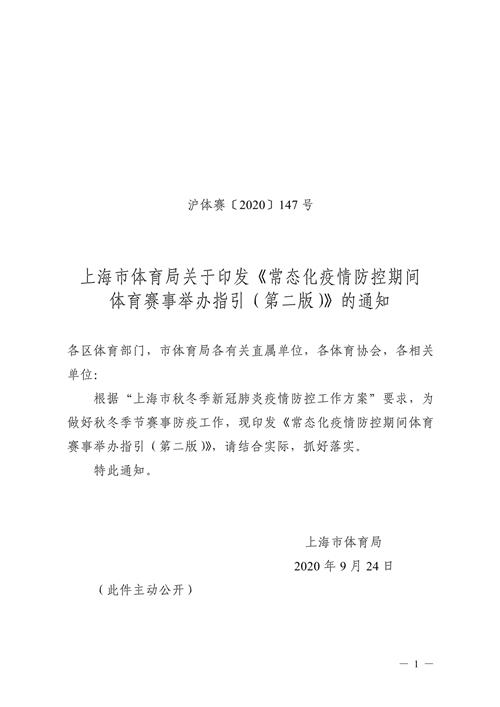 根据“上海市秋冬季新冠肺炎疫情防控工作方案”要求,为做好秋冬季节赛事防疫工作,现印发《常态化疫情防控期间体育赛事举办指引(第二版)》,请结合实际,抓好落实。