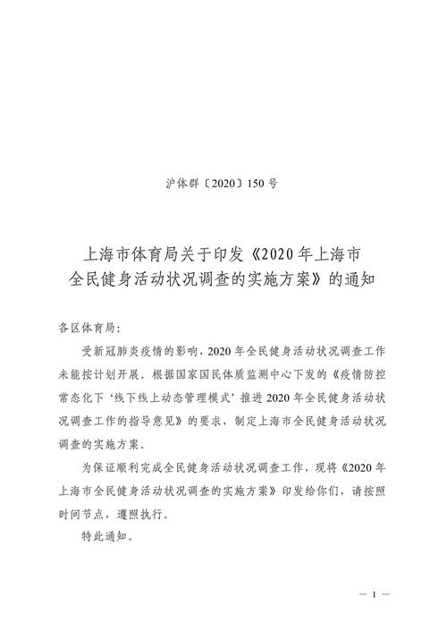 为保证顺利完成全民健身活动状况调查工作,现将《2020年上海市全民健身活动状况调查的实施方案》印发给你们,请按照时间节点,遵照执行。