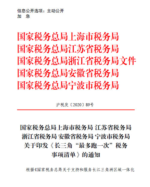 根据《国家税务总局关于支持和服务长江三角洲区域一体化发展措施的通知》(税总函〔2019〕356号)要求,为切实发挥税收支持和服务长三角一体化高质量发展的作用,落实“最多跑一次”改革,为纳税人提供规范化、标准化纳税服务,现将长三角“最多跑一次”税务事项清单印发给你们,请按照执行,严格抓好落实。本清单自发布之日起生效,三省两市原“最多跑一次” 事项清单与本清单不一致的,按本清单执行。