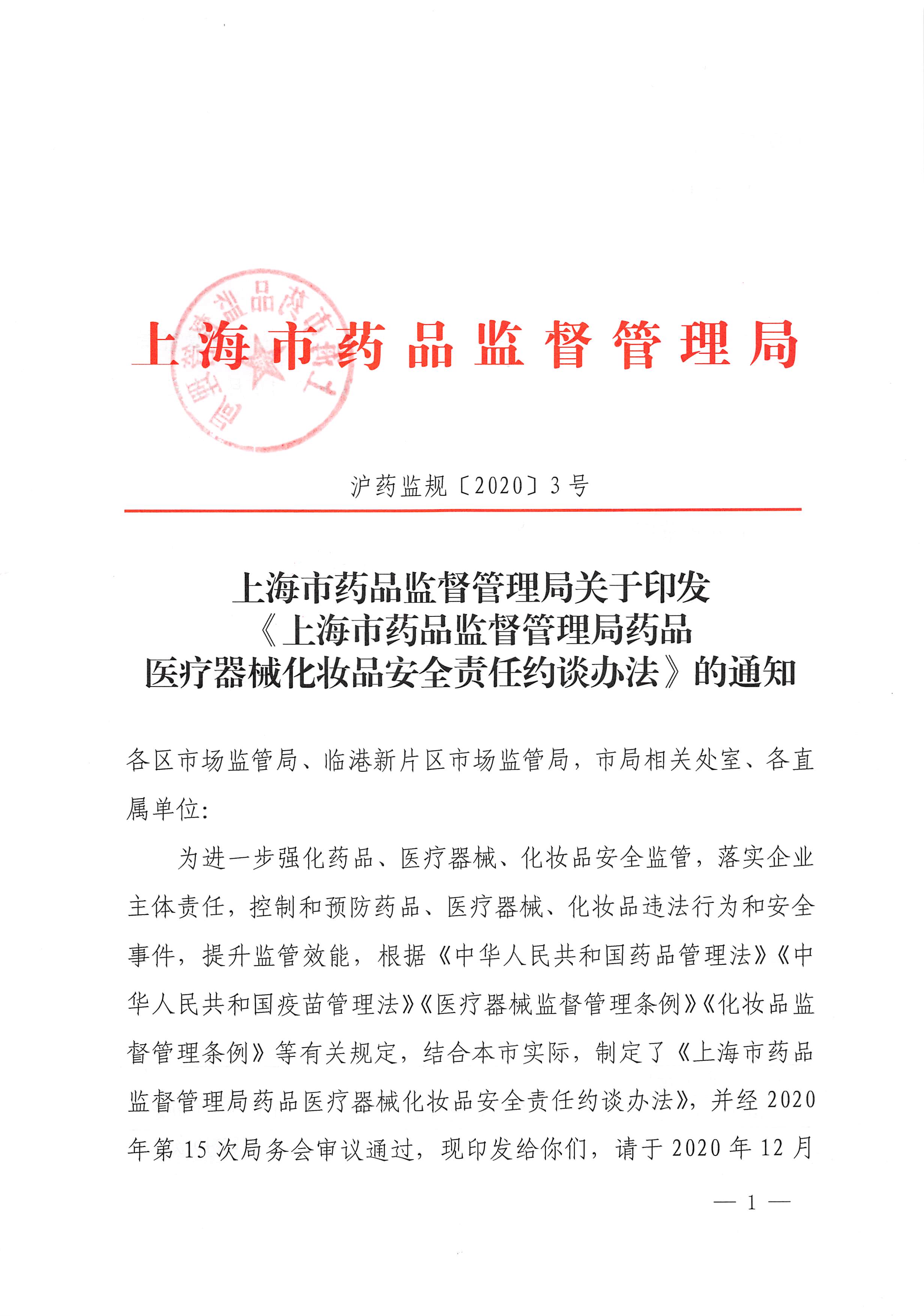 为进一步强化药品、医疗器械、化妆品安全监管,落实企业主体责任,控制和预防药品、医疗器械、化妆品违法行为和安全事件,提升监管效能,根据《中华人民共和国药品管理法》《中华人民共和国疫苗管理法》《医疗器械监督管理条例》《化妆品监督管理条例》等有关规定,结合本市实际,制定了《上海市药品监督管理局药品医疗器械化妆品安全责任约谈办法》,并经2020年第15次局务会审议通过,现印发给你们,请于2020年12月1日起执行。