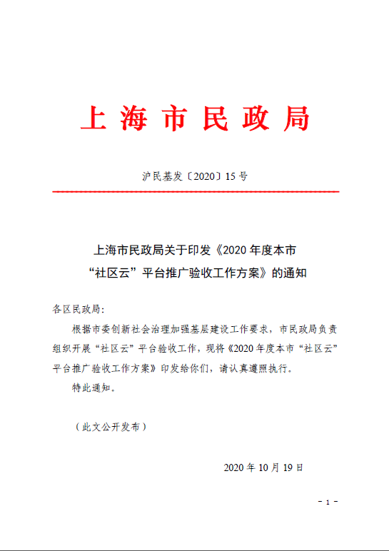 根据市委创新社会治理加强基层建设工作要求,市民政局负责组织开展“社区云”平台验收工作,现将《2020年度本市“社区云”平台推广验收工作方案》印发给你们,请认真遵照执行。
