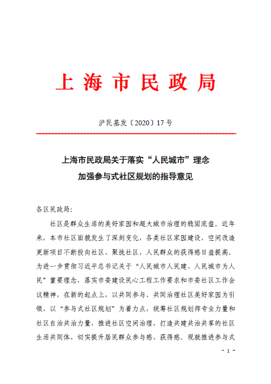 社区是群众生活的美好家园和超大城市治理的稳固底盘。近年来,本市社区面貌发生了深刻变化,各类社区家园建设、空间改造更新项目不断投向社区、聚拢社区,人民群众的获得感日益提高。为进一步贯彻习近平总书记关于“人民城市人民建、人民城市为人民”重要理念,落实市委建设民心工程工作要求和市委社区工作会议精神,在新的起点上,以共同参与、共同治理社区美好家园为引领,以“参与式社区规划”为着力点,统筹社区规划师专业力量和社区自治共治力量,推进社区空间治理,打造共建共治共享的社区生活共同体,切实提升居民群众参与感、获得感。现就推进参与式规划提出如下意见。