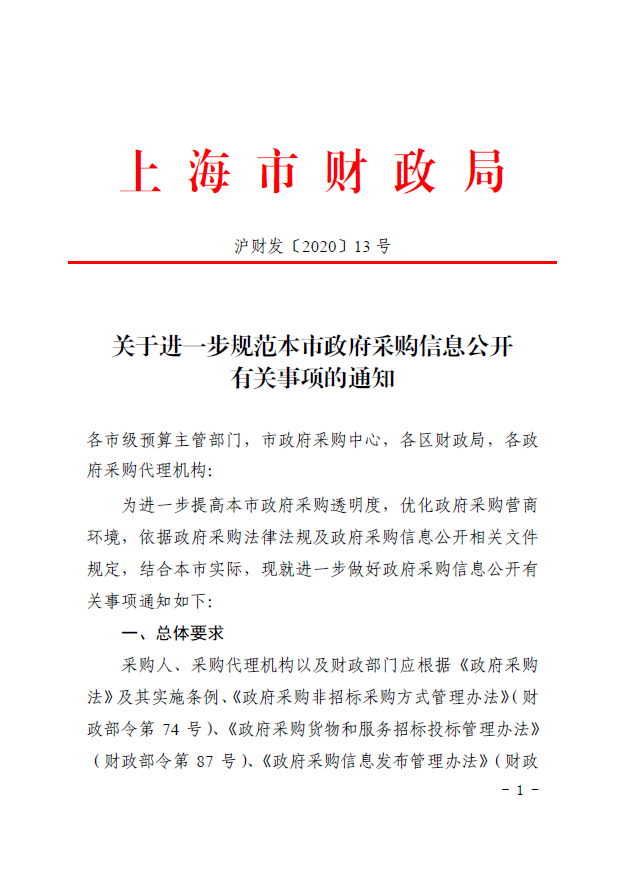 采购人、采购代理机构以及财政部门应根据《政府采购法》及其实施条例、《政府采购非招标采购方式管理办法》(财政部令第74号)、《政府采购货物和服务招标投标管理办法》(财政部令第87号)、《政府采购信息发布管理办法》(财政部令第101号)、《上海市政府采购实施办法》(沪府令第65号)、《关于做好政府采购信息公开工作的通知》(财库〔2015〕135号)以及《关于开展政府采购意向公开工作的通知》(财库〔2020〕10号)等相关文件规定,积极做好政府采购信息公开工作,并重点规范和完善单一来源采购方式公示、采购意向及采购结果公开。