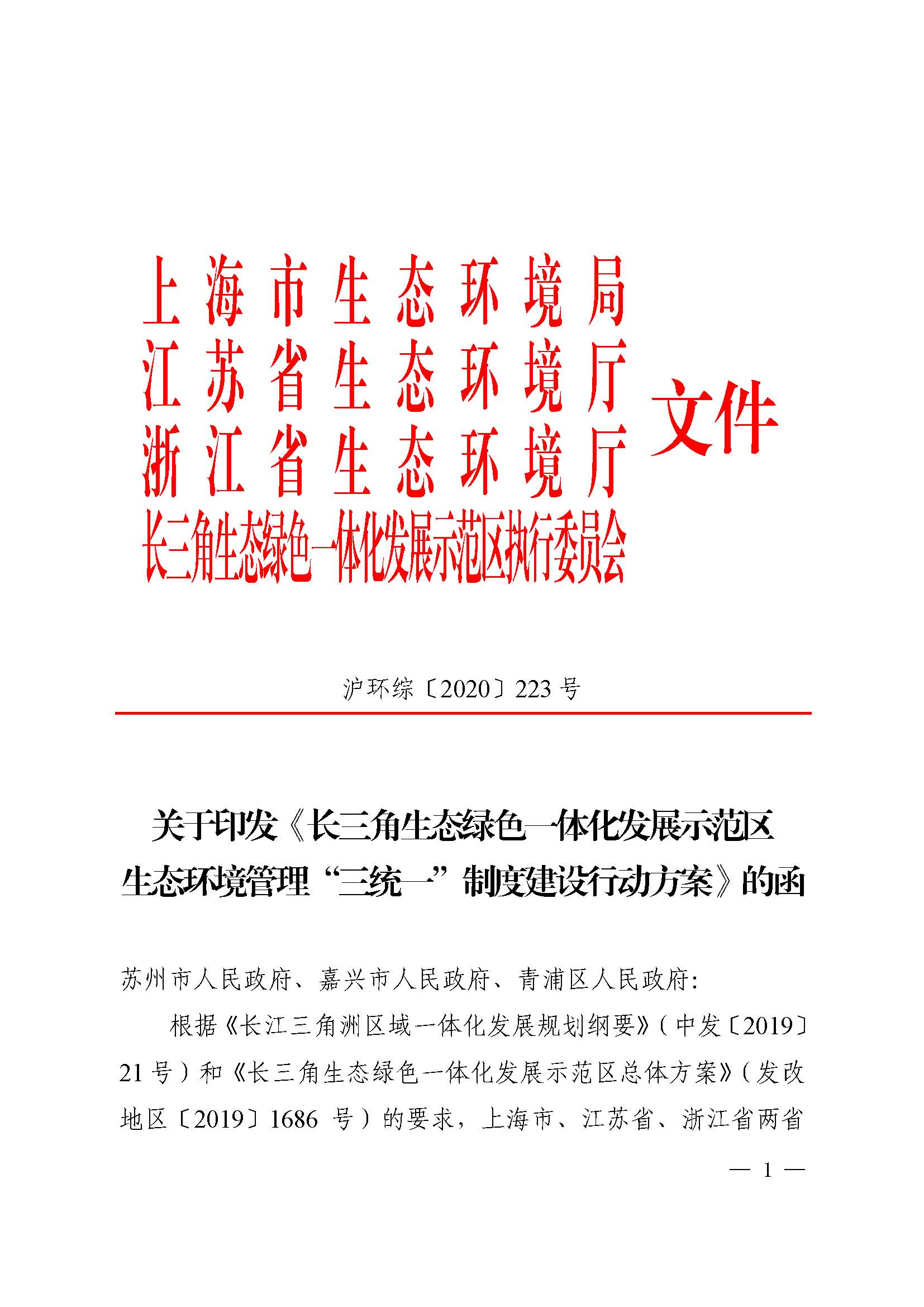 长三角生态绿色一体化发展示范区生态环境管理“三统一”制度建设行动方案