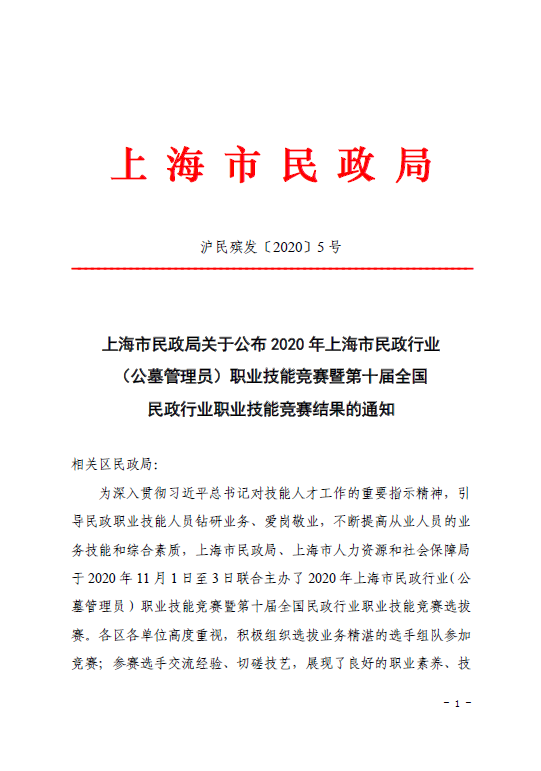 2020年上海市民政行业(公墓管理员)职业技能竞赛暨第十届全国民政行业职业技能竞赛选拔赛结果