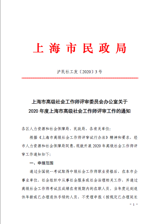 根据《上海市高级社会工作师评审试行办法》精神和要求,经市人力资源和社会保障局同意,现就开展2020年高级社会工作师评审工作通知如下: