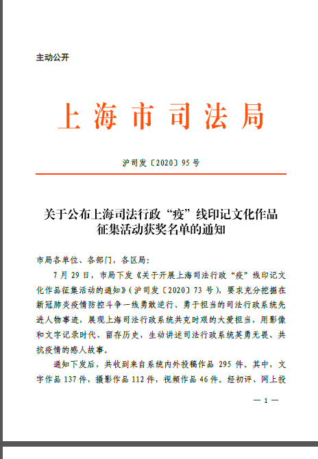 7月29日,市局下发《关于开展上海司法行政“疫”线印记文化作品征集活动的通知》(沪司发〔2020〕73号),要求充分挖掘在新冠肺炎疫情防控斗争一线勇敢逆行、勇于担当的司法行政系统先进人物事迹,展现上海司法行政系统共克时艰的大爱担当,用影像和文字记录时代、留存历史,生动讲述司法行政系统英勇无畏、共抗疫情的感人故事。