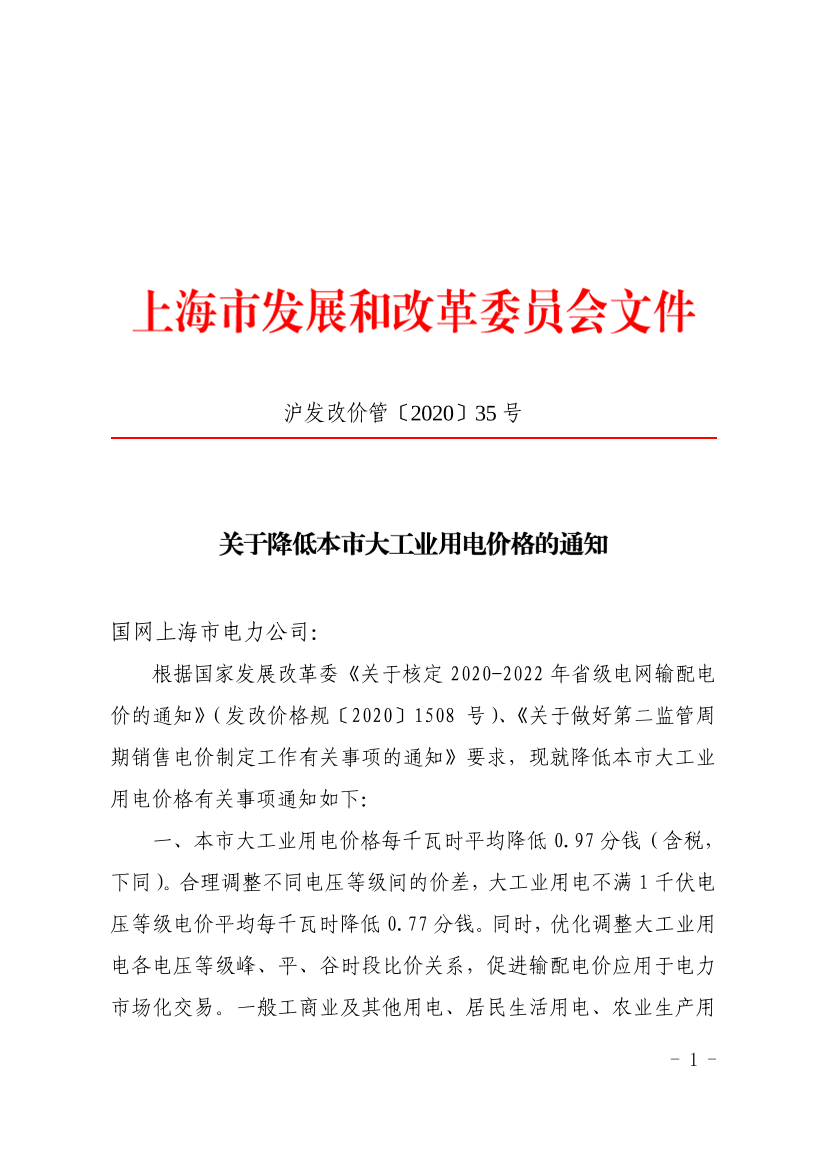 根据国家发展改革委《关于核定2020-2022年省级电网输配电价的通知》(发改价格规〔2020〕1508号)、《关于做好第二监管周期销售电价制定工作有关事项的通知》要求,现就降低本市大工业用电价格有关事项通知如下: