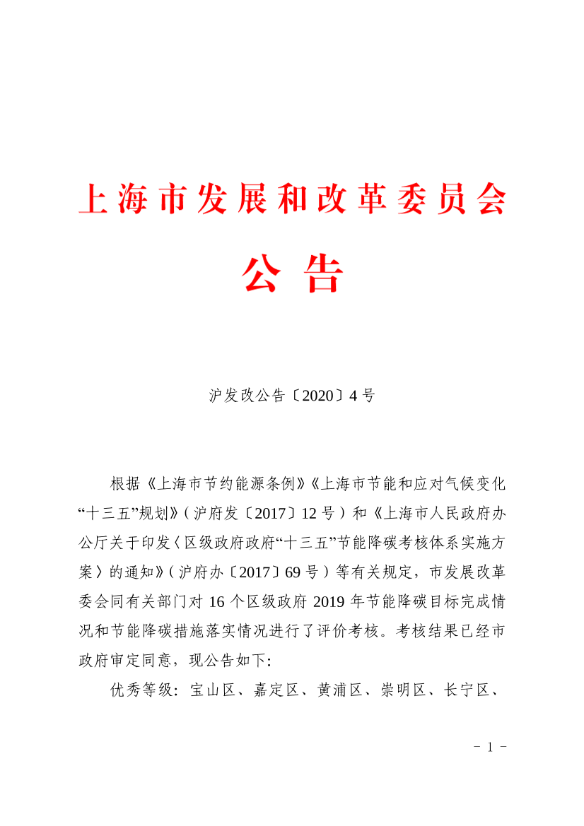 根据《上海市节约能源条例》《上海市节能和应对气候变化“十三五”规划》(沪府发〔2017〕12号)和《上海市人民政府办公厅关于印发〈区级政府政府“十三五”节能降碳考核体系实施方案〉的通知》(沪府办〔2017〕69号)等有关规定,市发展改革委会同有关部门对16个区级政府2019年节能降碳目标完成情况和节能降碳措施落实情况进行了评价考核。考核结果已经市政府审定同意,现公告如下: