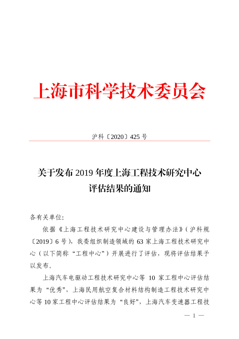 依据《上海工程技术研究中心建设与管理办法》(沪科规〔2019〕6号),我委组织制造领域的63家上海工程技术研究中心(以下简称“工程中心”)开展进行了评估,现将评估结果予以发布。