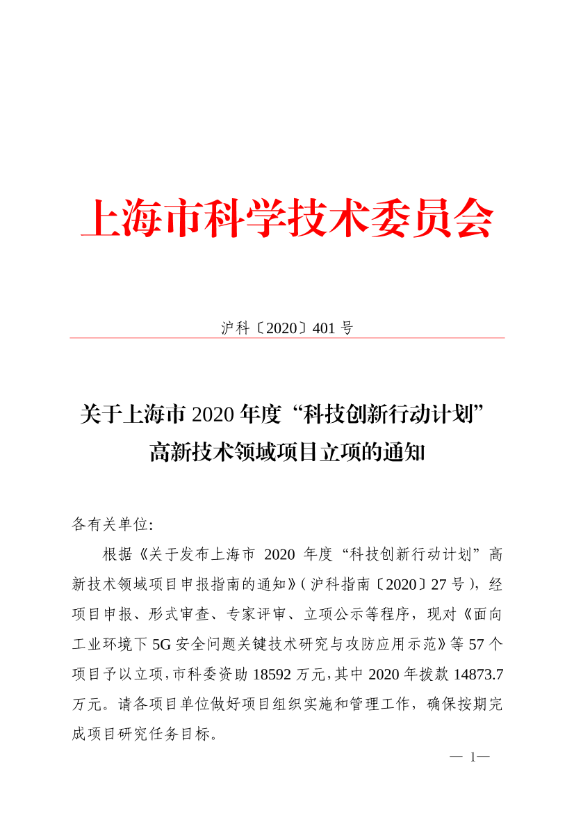 根据《关于发布上海市2020年度“科技创新行动计划”高新技术领域项目申报指南的通知》(沪科指南〔2020〕27号),经项目申报、形式审查、专家评审、立项公示等程序,现对《面向工业环境下5G安全问题关键技术研究与攻防应用示范》等57个项目予以立项,市科委资助18592万元,其中2020年拨款14873.7万元。请各项目单位做好项目组织实施和管理工作,确保按期完成项目研究任务目标。