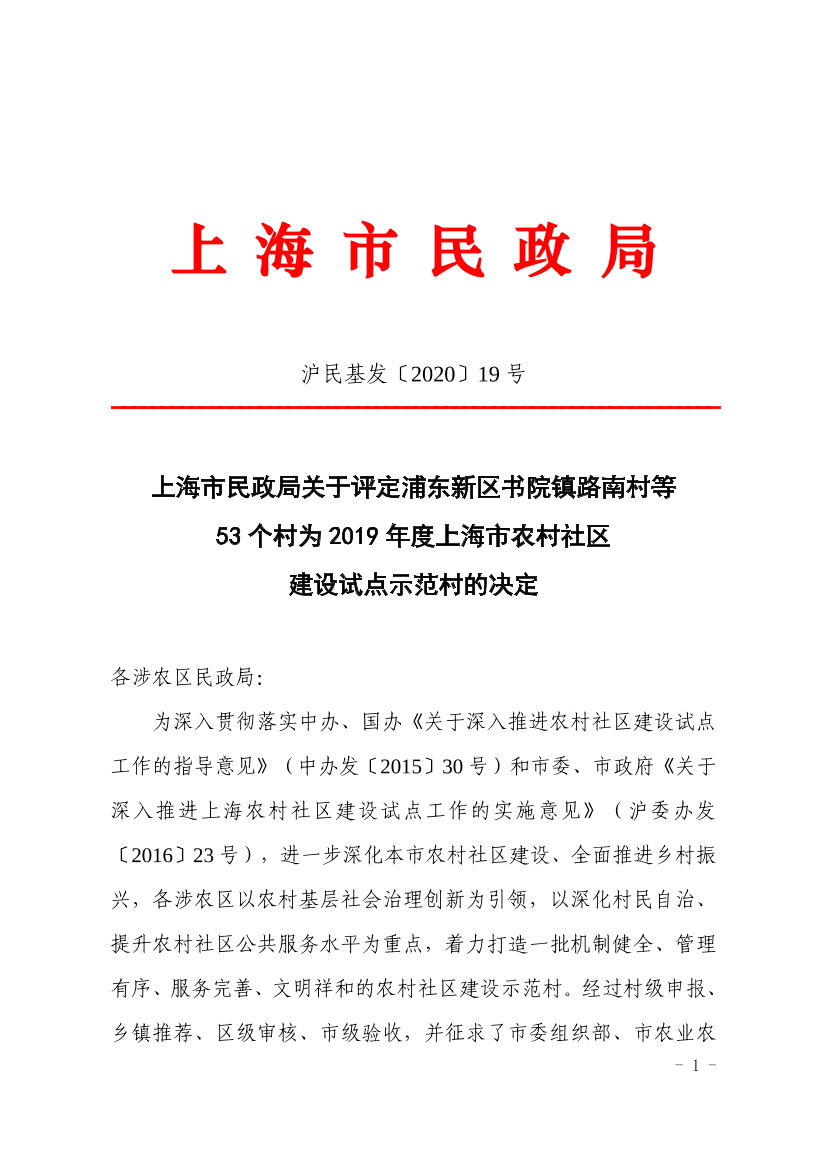 为深入贯彻落实中办、国办《关于深入推进农村社区建设试点工作的指导意见》(中办发〔2015〕30号)和市委、市政府《关于深入推进上海农村社区建设试点工作的实施意见》(沪委办发〔2016〕23号),进一步深化本市农村社区建设、全面推进乡村振兴,各涉农区以农村基层社会治理创新为引领,以深化村民自治、提升农村社区公共服务水平为重点,着力打造一批机制健全、管理有序、服务完善、文明祥和的农村社区建设示范村。经过村级申报、乡镇推荐、区级审核、市级验收,并征求了市委组织部、市农业农村委、市发展改革委、市住房城乡建设管理委意见,综合评定浦东新区书院镇路南村等53个村为2019年度上海市农村社区建设试点示范村。