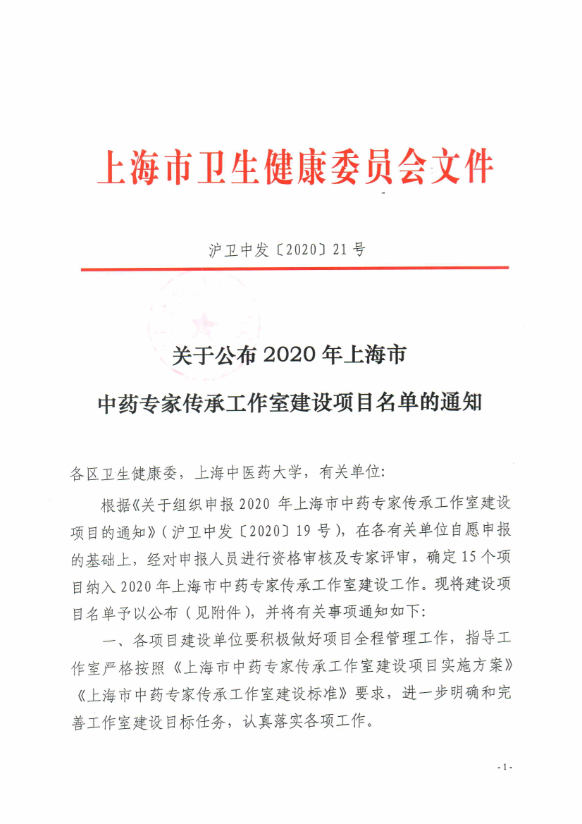 根据《关于组织申报2020 年上海市中药专家传承工作室建设项目的通知》(沪卫中发〔2020〕19号),在各有关单位自愿申报的基础上,经对申报人员进行资格审核及专家评审,确定15个项目纳入2020年上海市中药专家传承工作室建设工作。现将建设项目名单予以公布(见附件),并将有关事项通知如下: