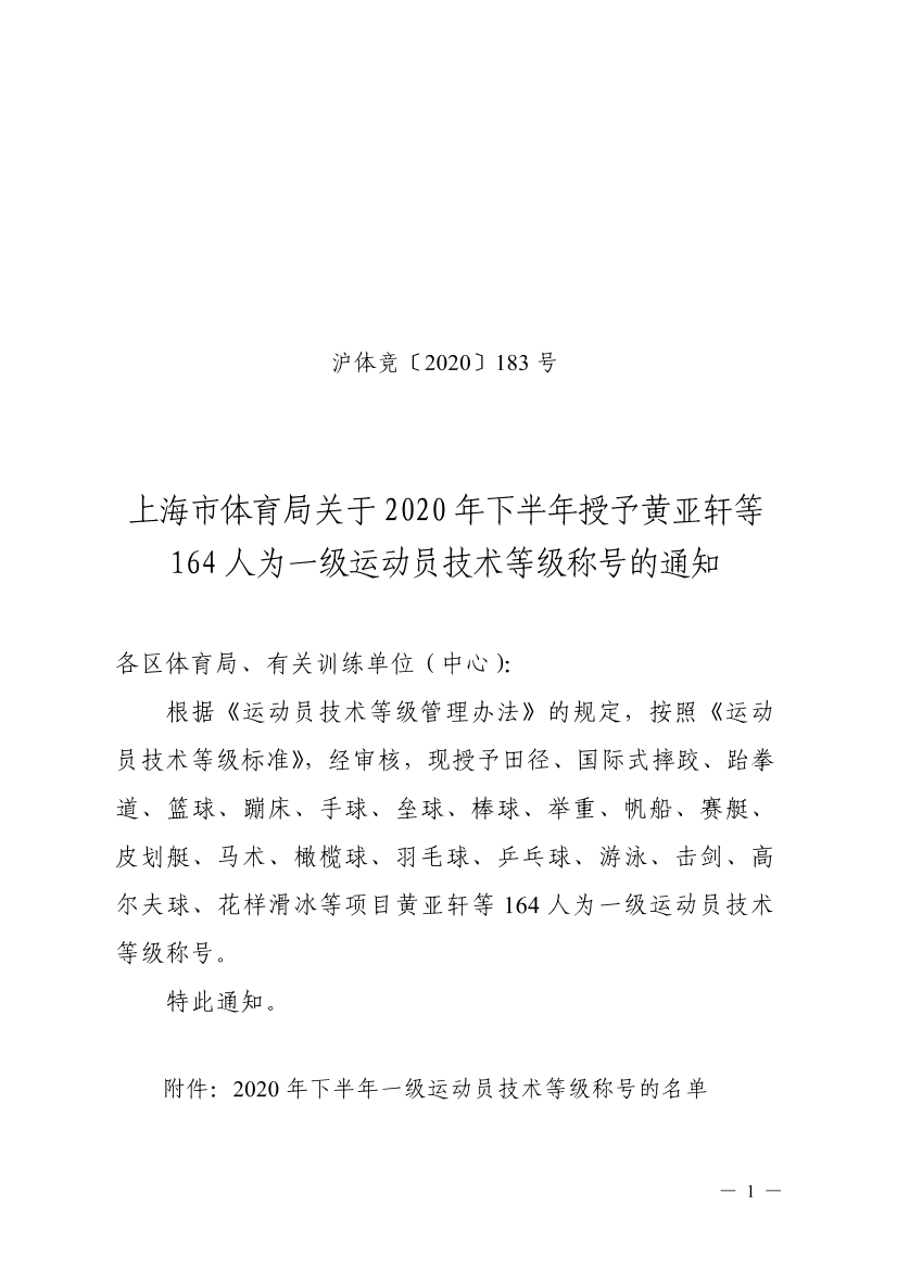 根据《运动员技术等级管理办法》的规定,按照《运动员技术等级标准》,经审核,现授予田径、国际式摔跤、跆拳道、篮球、蹦床、手球、垒球、棒球、举重、帆船、赛艇、皮划艇、马术、橄榄球、羽毛球、乒乓球、游泳、击剑、高尔夫球、花样滑冰等项目黄亚轩等164人为一级运动员技术等级称号。