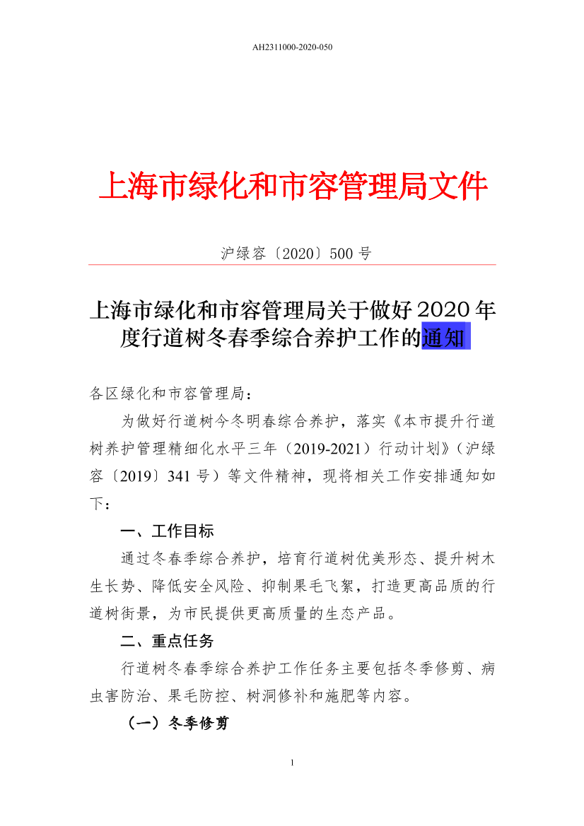 为做好行道树今冬明春综合养护,落实《本市提升行道树养护管理精细化水平三年(2019-2021)行动计划》(沪绿容〔2019〕341号)等文件精神,现将相关工作安排通知如下: