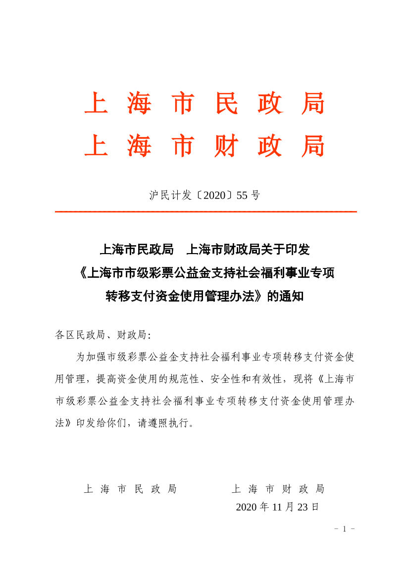 为加强市级彩票公益金支持社会福利事业专项转移支付资金使用管理,提高资金使用的规范性、安全性和有效性,现将《上海市市级彩票公益金支持社会福利事业专项转移支付资金使用管理办法》印发给你们,请遵照执行。