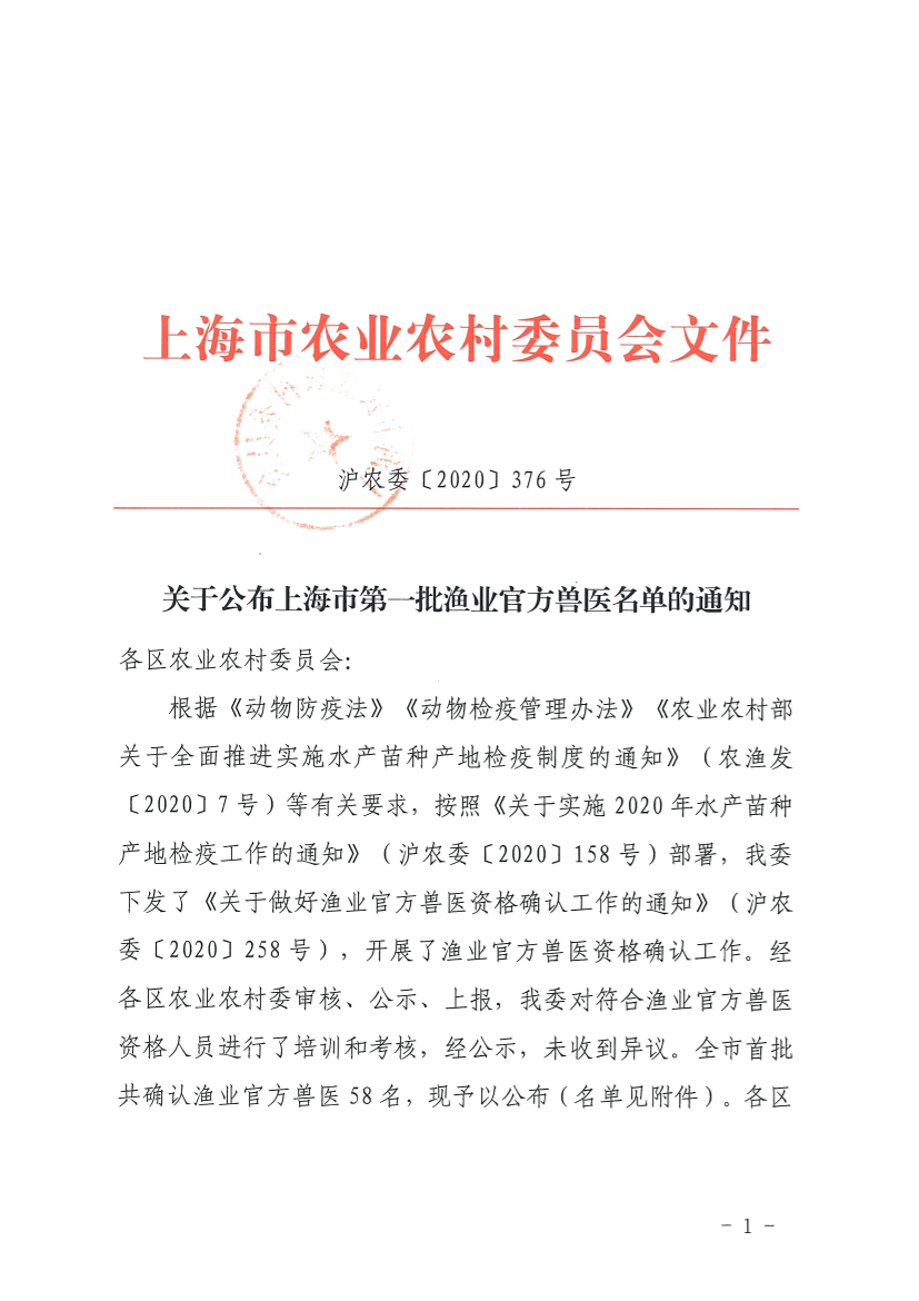 根据《动物防疫法》《动物检疫管理办法》《农业农村部关于全面推进实施水产苗种产地检疫制度的通知》(农渔发〔2020〕7号)等有关要求,按照《关于实施2020年水产苗种产地检疫工作的通知》(沪农委〔2020〕158号)部署,我委下发了《关于做好渔业官方兽医资格确认工作的通知》(沪农委〔2020〕258号),开展了渔业官方兽医资格确认工作。经各区农业农村委审核、公示、上报,我委对符合渔业官方兽医资格人员进行了培训和考核,经公示,未收到异议。全市首批共确认渔业官方兽医58名,现予以公布(名单见附件)。各区农业农村委要加强对渔业官方兽医的管理指导,支持渔业官方兽医依法依规开展水产苗种产地检疫工作。