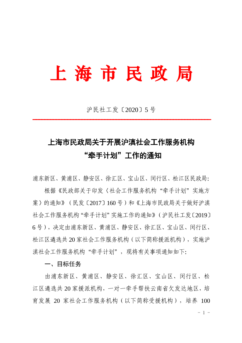 根据《民政部关于印发〈社会工作服务机构“牵手计划”实施方案〉的通知》(民发〔2017〕160号)和《上海市民政局关于做好沪滇社会工作服务机构“牵手计划”实施工作的通知》(沪民社工发〔2019〕6号),决定由浦东新区、黄浦区、静安区、徐汇区、宝山区、闵行区、松江区遴选共20家社会工作服务机构(以下简称援派机构),实施沪滇社会工作服务机构“牵手计划”,现将有关事项通知如下: