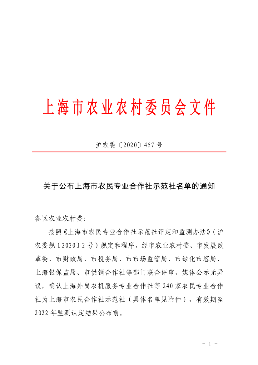 按照《上海市农民专业合作社示范社评定和监测办法》(沪农委规〔2020〕2号)规定和程序,经市农业农村委、市发展改革委、市财政局、市税务局、市市场监管局、市绿化市容局、上海银保监局、市供销合作社等部门联合评审,媒体公示无异议,确认上海外岗农机服务专业合作社等240家农民专业合作社为上海市农民合作社示范社(具体名单见附件),有效期至2022年监测认定结果公布前。