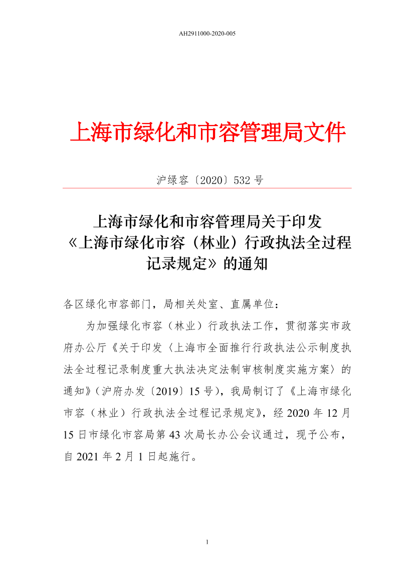 为加强绿化市容(林业)行政执法工作,贯彻落实市政府办公厅《关于印发〈上海市全面推行行政执法公示制度执法全过程记录制度重大执法决定法制审核制度实施方案〉的通知》(沪府办发〔2019〕15号),我局制订了《上海市绿化市容(林业)行政执法全过程记录规定》,经2020年12月15日市绿化市容局第43次局长办公会议通过,现予公布,自2021年2月1日起施行。