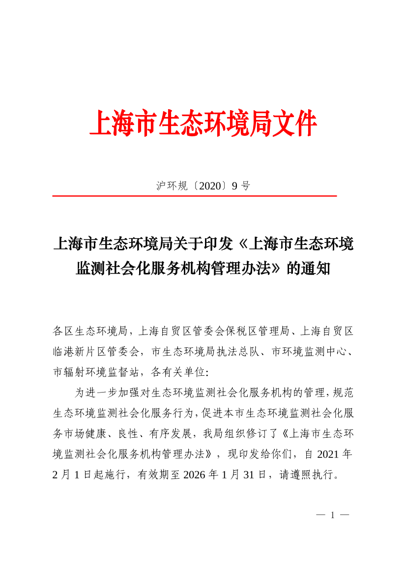 为进一步加强对生态环境监测社会化服务机构的管理,规范生态环境监测社会化服务行为,促进本市生态环境监测社会化服务市场健康、良性、有序发展,我局组织修订了《上海市生态环境监测社会化服务机构管理办法》,现印发给你们,自2021年2月1日起施行,有效期至2026年1月31日,请遵照执行。