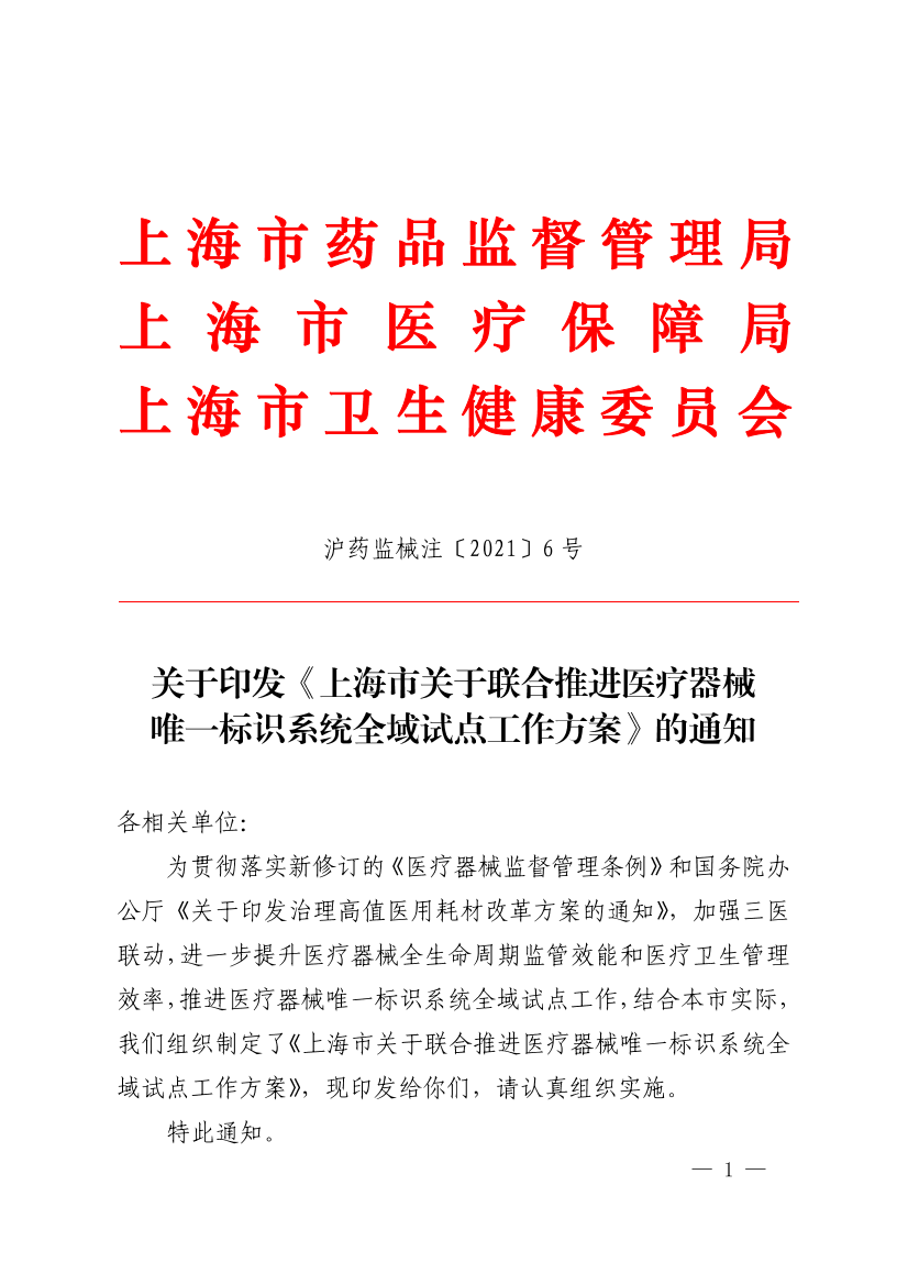 为贯彻落实新修订的《医疗器械监督管理条例》和国务院办公厅《关于印发治理高值医用耗材改革方案的通知》,加强三医联动,进一步提升医疗器械全生命周期监管效能和医疗卫生管理效率,推进医疗器械唯一标识系统全域试点工作,结合本市实际,我们组织制定了《上海市关于联合推进医疗器械唯一标识系统全域试点工作方案》,现印发给你们,请认真组织实施。