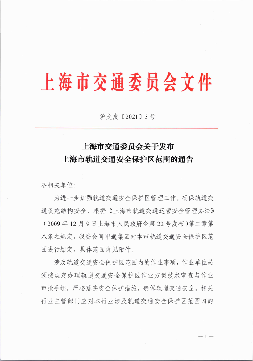 为进一步加强轨道交通安全保护区管理工作,确保轨道交通设施结构安全,根据《上海市轨道交通运营安全管理办法》(2009年12月9日上海市人民政府令第22号发布)第二章第八条之规定,我委会同申通集团对本市轨道交通安全保护区范围进行划定,具体范围详见附件。