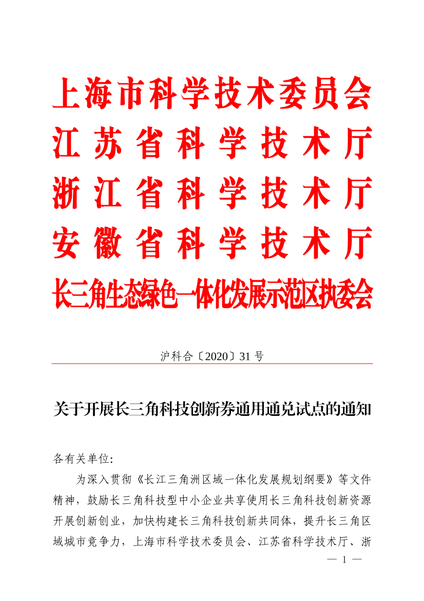 为深入贯彻《长江三角洲区域一体化发展规划纲要》等文件精神,鼓励长三角科技型中小企业共享使用长三角科技创新资源开展创新创业,加快构建长三角科技创新共同体,提升长三角区域城市竞争力,上海市科学技术委员会、江苏省科学技术厅、浙江省科学技术厅、安徽省科学技术厅,长三角生态绿色一体化发展示范区执委会现就试点区域开展长三角科技创新券通用通兑试点工作通知如下。