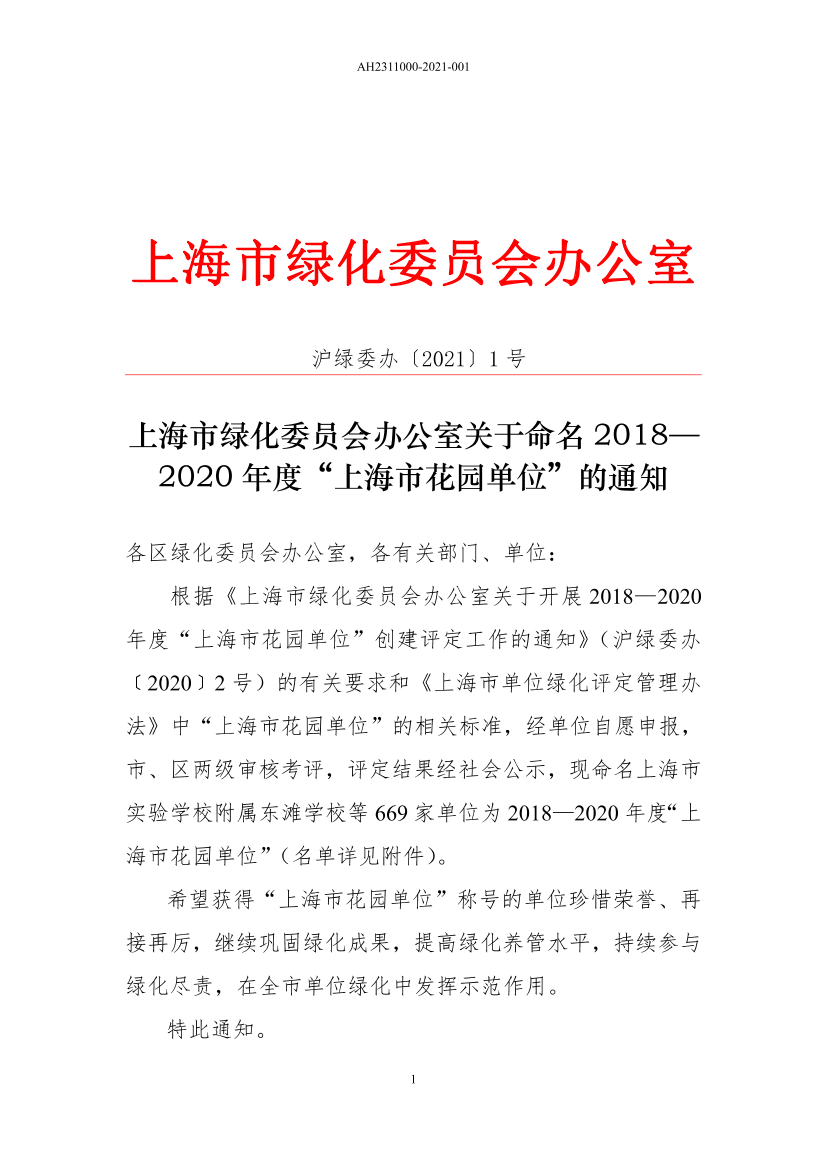 根据《上海市绿化委员会办公室关于开展2018—2020年度“上海市花园单位”创建评定工作的通知》(沪绿委办﹝2020﹞2号)的有关要求和《上海市单位绿化评定管理办法》中“上海市花园单位”的相关标准,经单位自愿申报,市、区两级审核考评,评定结果经社会公示,现命名上海市实验学校附属东滩学校等669家单位为2018—2020年度“上海市花园单位”(名单详见附件)。