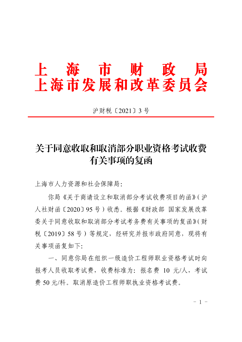 一、同意你局在组织一级造价工程师职业资格考试时向报考人员收取考试费,收费标准为:报名费10元/人,考试费50元/科。取消原造价工程师职执业资格考试费。
