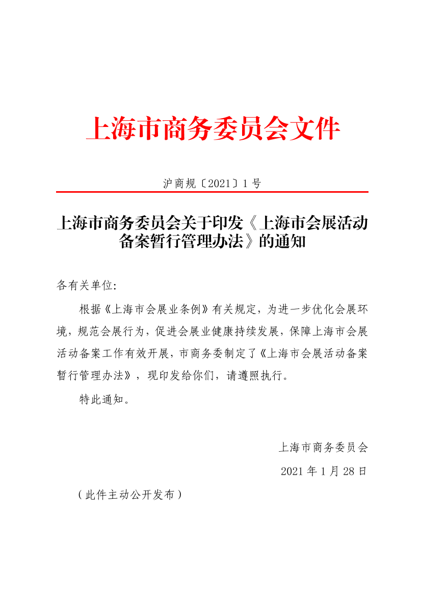 根据《上海市会展业条例》有关规定,为进一步优化会展环境,规范会展行为,促进会展业健康持续发展,保障上海市会展活动备案工作有效开展,市商务委制定了《上海市会展活动备案暂行管理办法》,现印发给你们,请遵照执行。