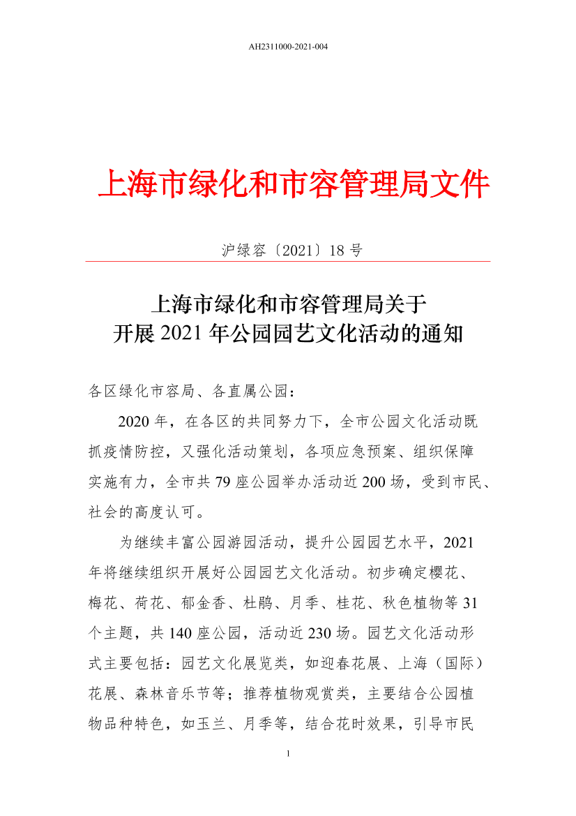 为继续丰富公园游园活动,提升公园园艺水平,2021年将继续组织开展好公园园艺文化活动。初步确定樱花、梅花、荷花、郁金香、杜鹃、月季、桂花、秋色植物等31个主题,共140座公园,活动近230场。园艺文化活动形式主要包括:园艺文化展览类,如迎春花展、上海(国际)花展、森林音乐节等;推荐植物观赏类,主要结合公园植物品种特色,如玉兰、月季等,结合花时效果,引导市民游览观赏。本活动同时也作为市民绿化节系列活动之一。