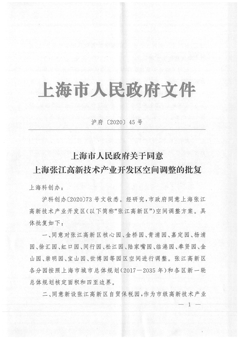 附件:上海市人民政府关于同意张江高新技术产业开发区空间调整的批复(沪府〔2020〕45号)