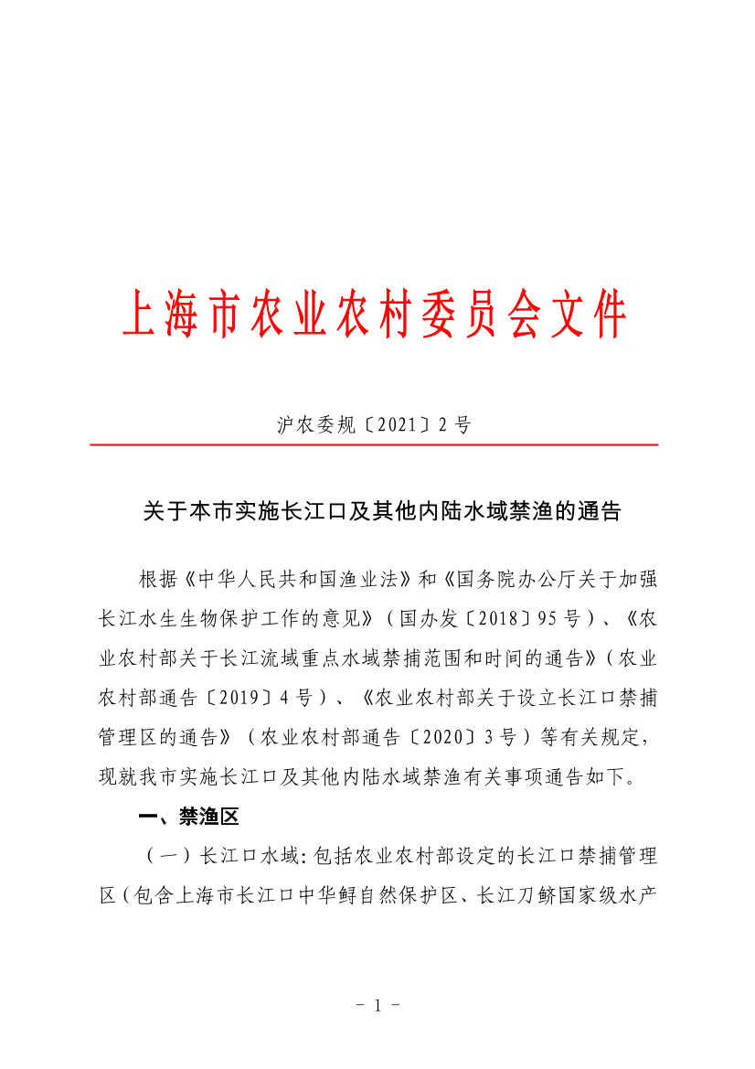 根据《中华人民共和国渔业法》和《国务院办公厅关于加强长江水生生物保护工作的意见》(国办发〔2018〕95号)、《农业农村部关于长江流域重点水域禁捕范围和时间的通告》(农业农村部通告〔2019〕4号)、《农业农村部关于设立长江口禁捕管理区的通告》(农业农村部通告〔2020〕3号)等有关规定,现就我市实施长江口及其他内陆水域禁渔有关事项通告如下。