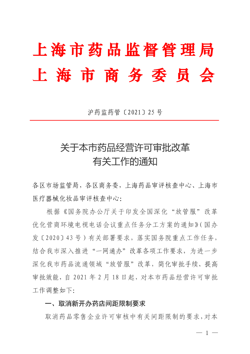取消药品零售企业许可审核中有关间距限制的要求,对本市新申请的药品零售企业,或原药品零售企业申请变更注册地址的,与附近药店的距离不再作为许可审查条件。原《上海市药品零售企业许可验收实施细则》(沪药监规〔2019〕1号)第十四条停止执行。