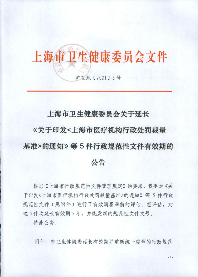 根据《上海市行政规范性文件管理规定》的要求,我委对《关于印发<上海市医疗机构行政处罚裁量基准>的通知》等5件行政规范性文件(见附件)进行了有效期届满前的评估。经评估,对这5件均延长有效期5年,并配发新的规范性文件文号。