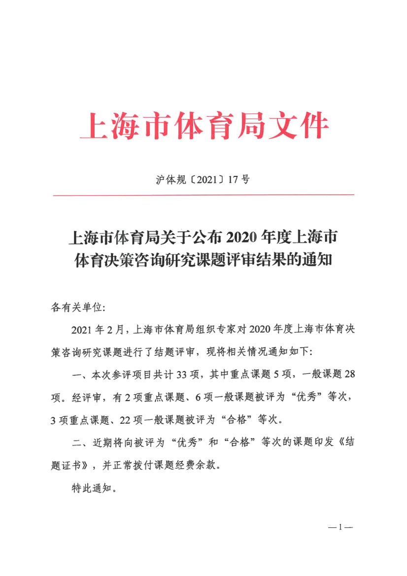 2021年2月,上海市体育局组织专家对2020年度上海市体育决策咨询研究课题进行了结题评审,现将相关情况通知如下: