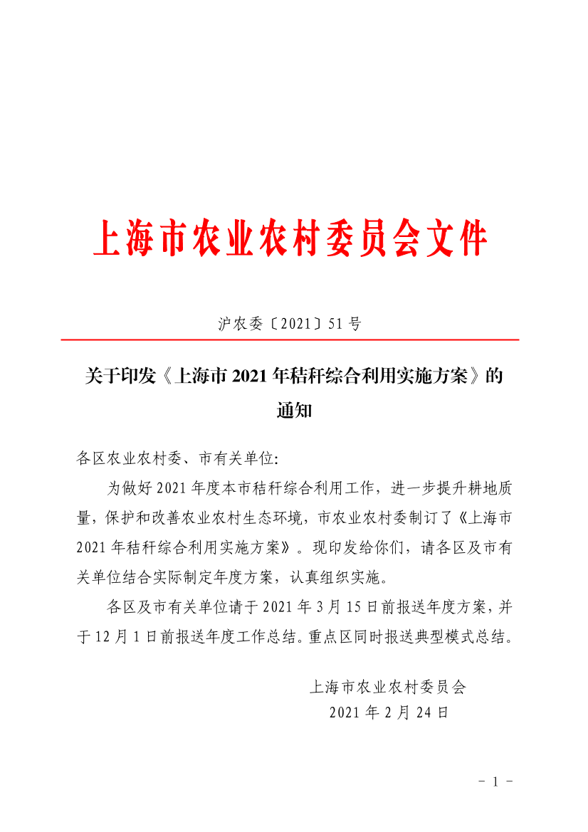 为做好2021年度本市秸秆综合利用工作,进一步提升耕地质量,保护和改善农业农村生态环境,市农业农村委制订了《上海市2021年秸秆综合利用实施方案》。现印发给你们,请各区及市有关单位结合实际制定年度方案,认真组织实施。