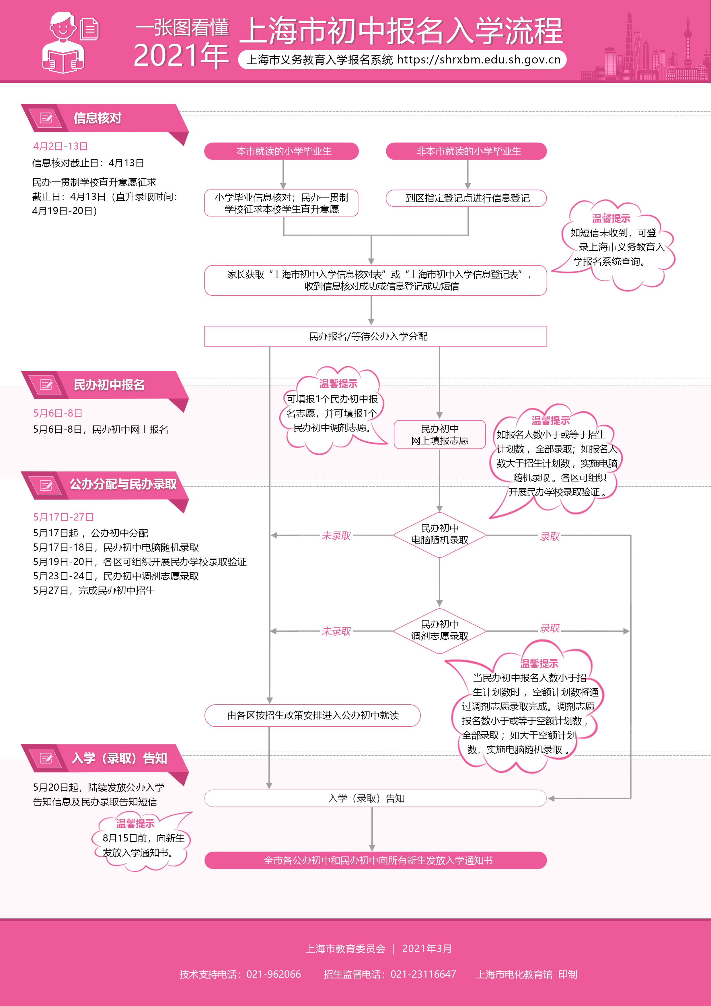 1.小学毕业信息核对。4月2日-4月13日,各区有序组织本市户籍和符合条件的非本市户籍小学五年级学生家长对“上海市义务教育入学报名系统”中的户籍地址、居住地址等入学关键信息进行核对,并填写监护人手机号码(作为接收初中入学信息的联系方式),如发现有关信息与实际情况不符的,家长应及时凭有效证件到学生就读小学进行更正。同时,各区组织民办一贯制学校征求本校学生直升意愿。4月13日为本市小学五年级学生初中入学关键信息核对、更正截止日。