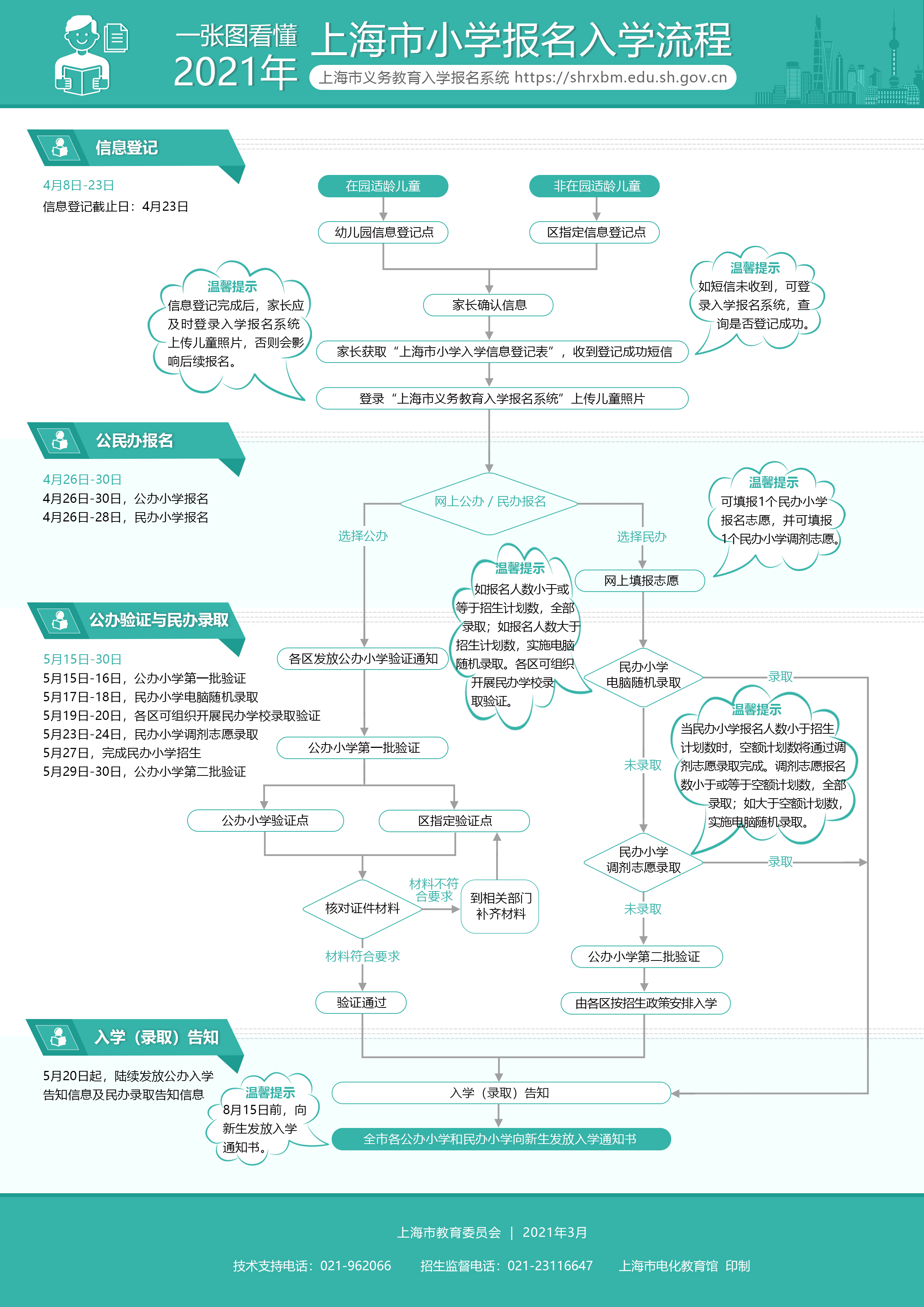 4月8日-4月23日,在园适龄儿童家长在幼儿园登记孩子入学信息,未入园适龄儿童家长在各区指定地点登记孩子入学信息,获取《上海市小学入学信息登记表》和“入学报名告知书”。4月23日为本市小学入学信息登记截止日,之后不得更改入学信息。家长获取《上海市小学入学信息登记表》后,须按照规定样式上传适龄儿童的照片,作为入学报名的重要依据。登记点应当告知照片上传的有关要求。