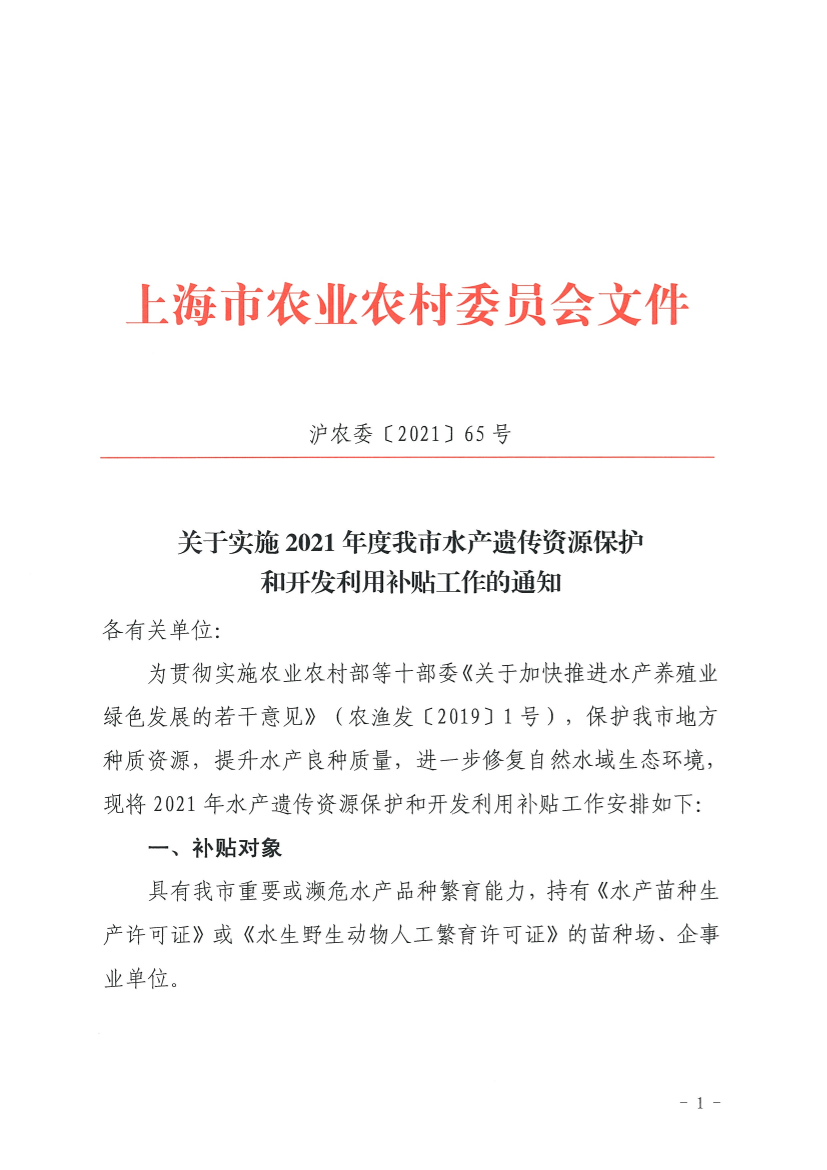 1.水产遗传资源保护:根据《关于印发本市畜禽、水产种质资源保护市级财政补贴标准的通知》(沪农委〔2018〕230号)补贴标准实施。