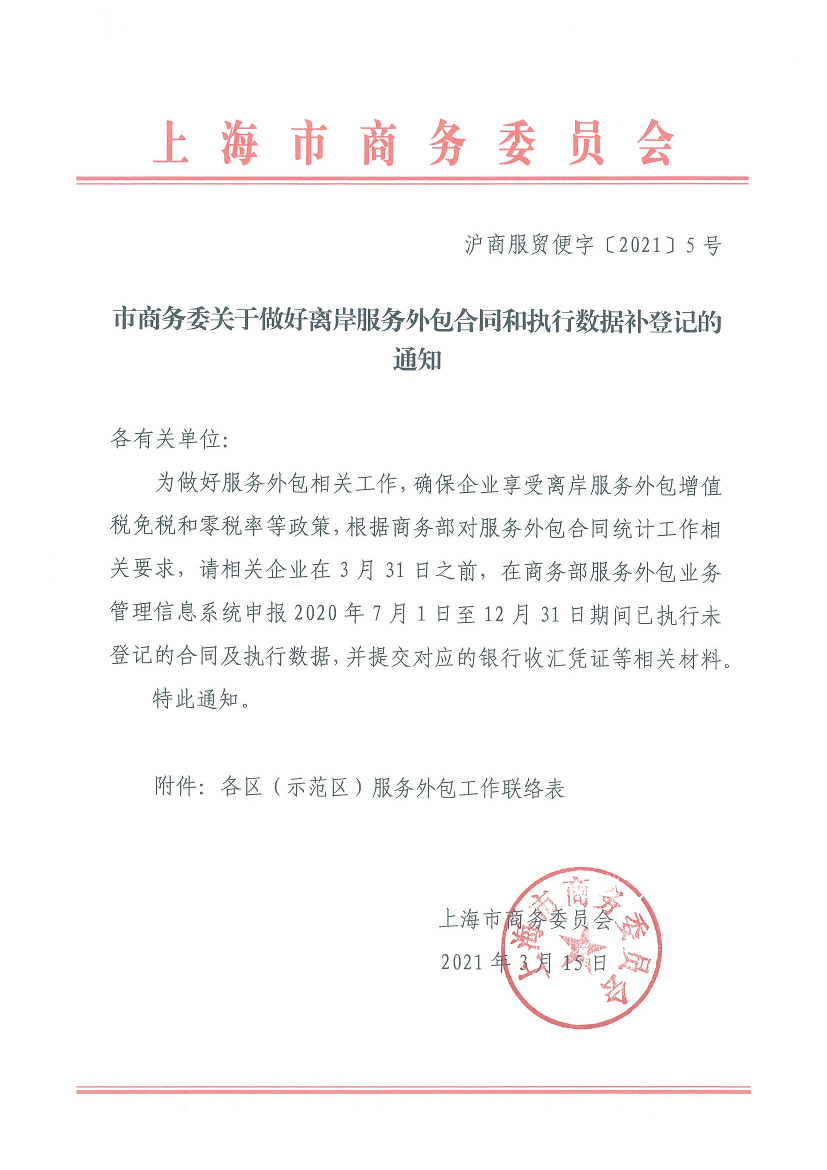 为做好服务外包相关工作,确保企业享受离岸服务外包增值税免税和零税率等政策,根据商务部对服务外包合同统计工作相关要求,请相关企业务必在3月31日之前,在商务部服务外包业务管理信息系统申报2020年7月1日至12月31日期间已执行未登记的合同及执行数据,并提交对应的银行收汇凭证等相关材料。