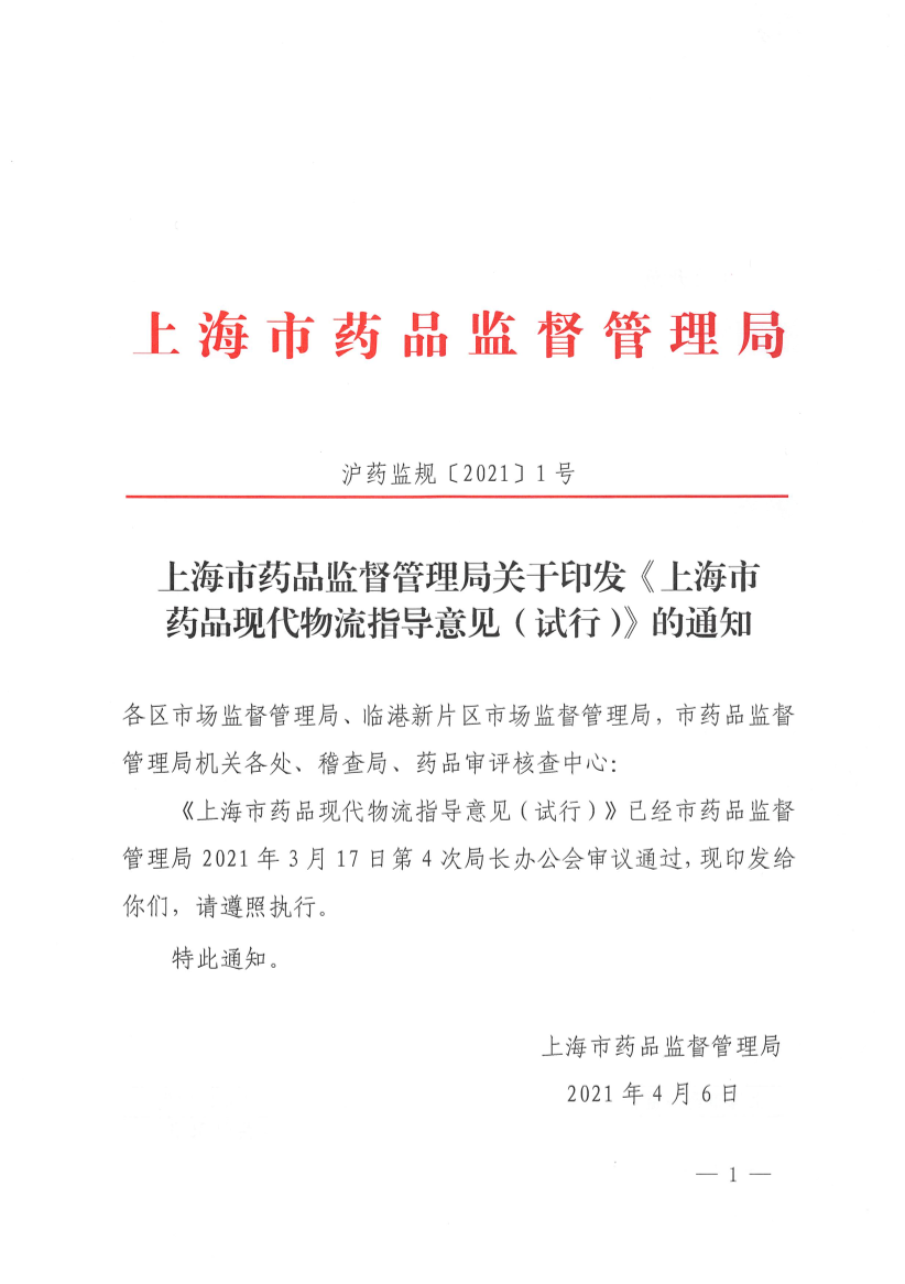《上海市药品现代物流指导意见(试行)》已经市药品监督管理局2021年3月17日第4次局长办公会审议通过,现印发给你们,请遵照执行。